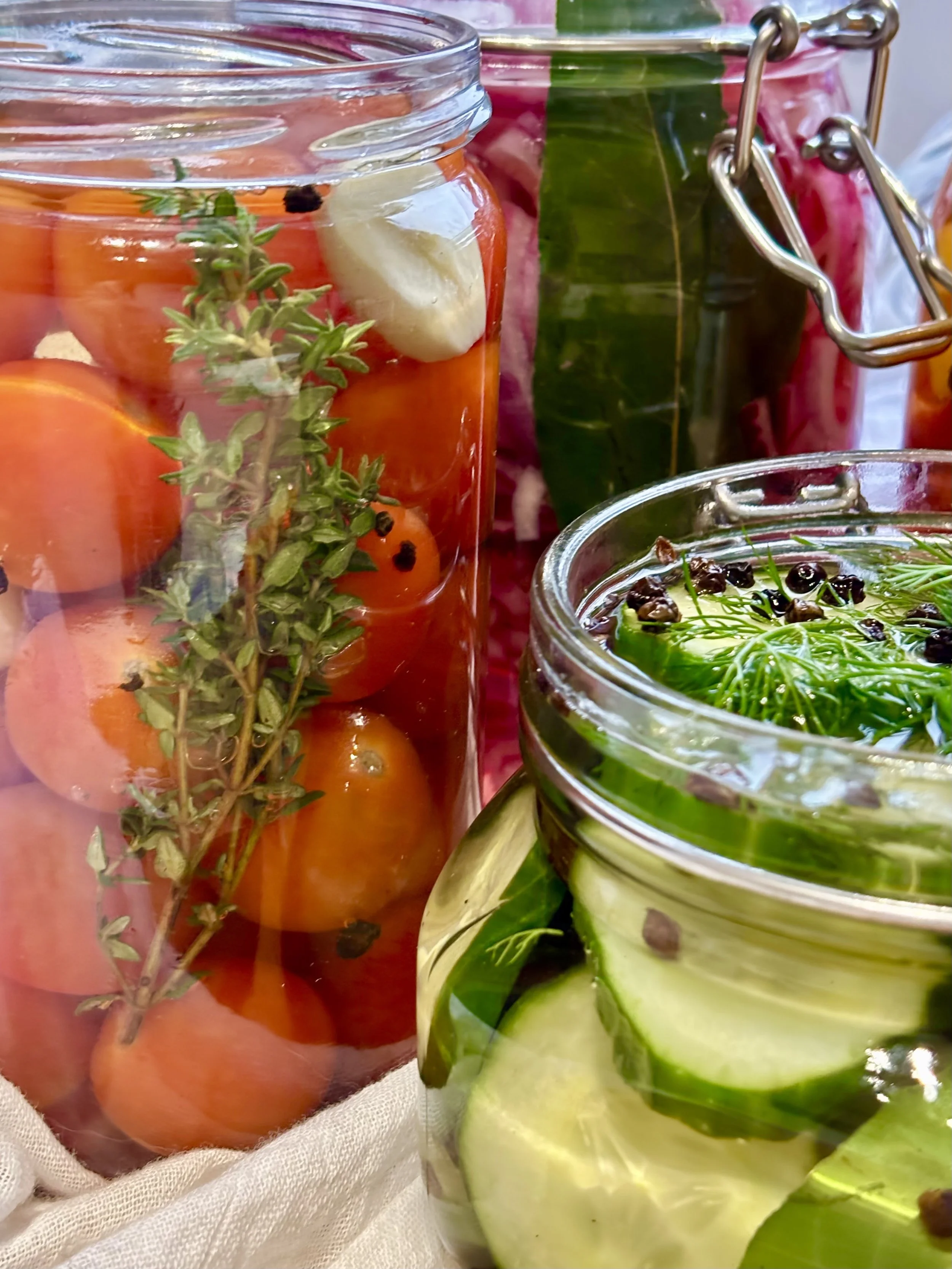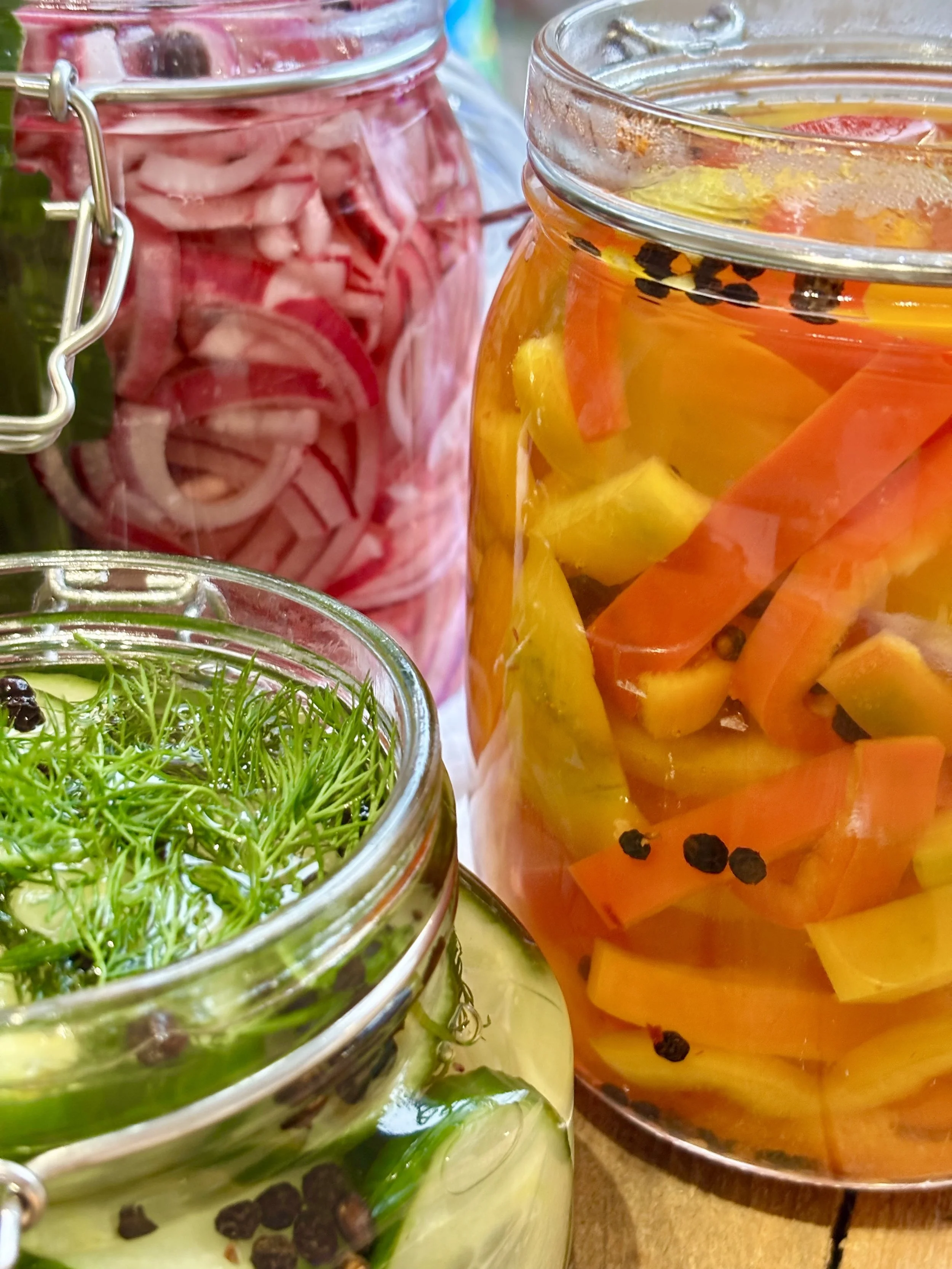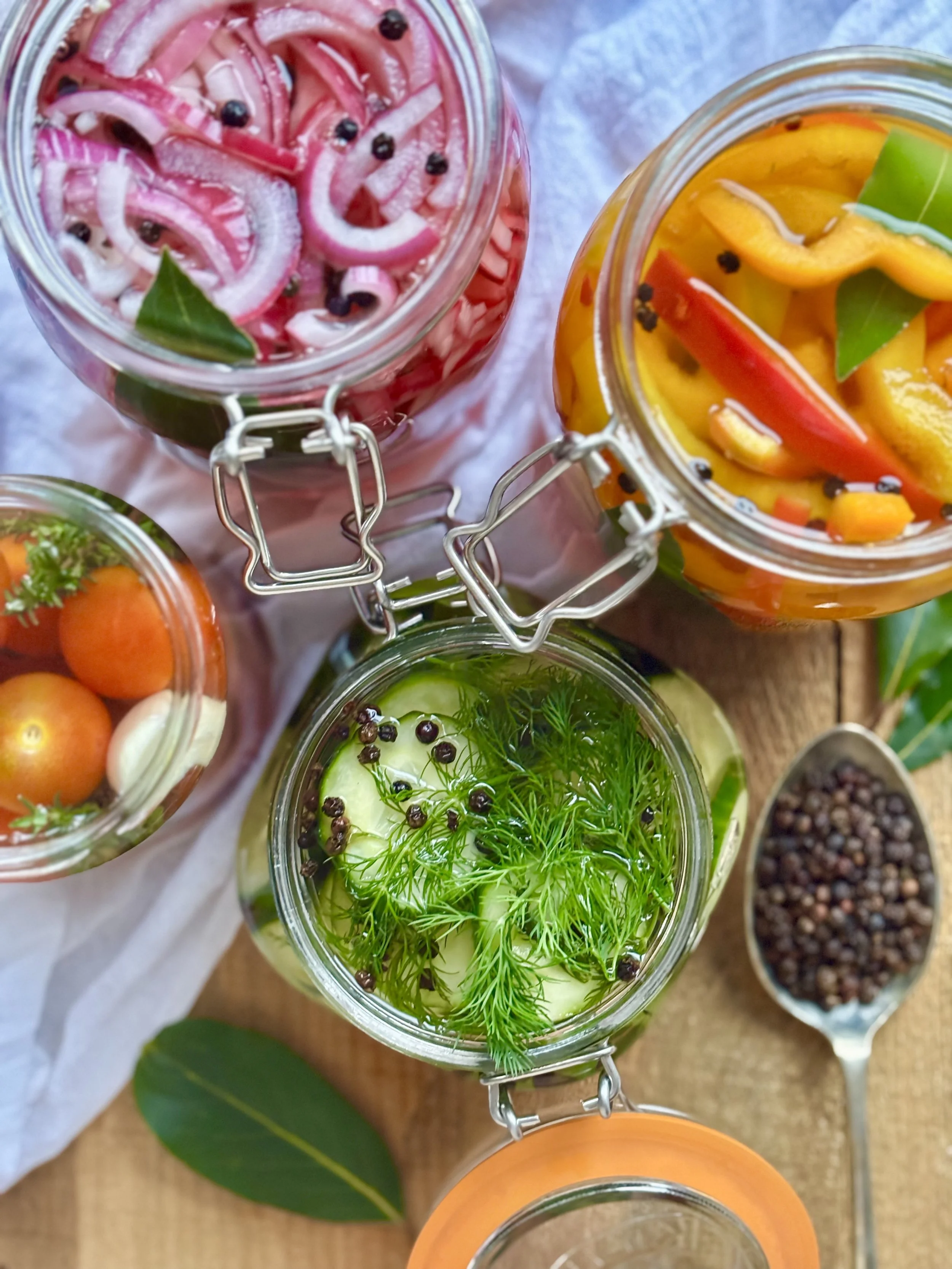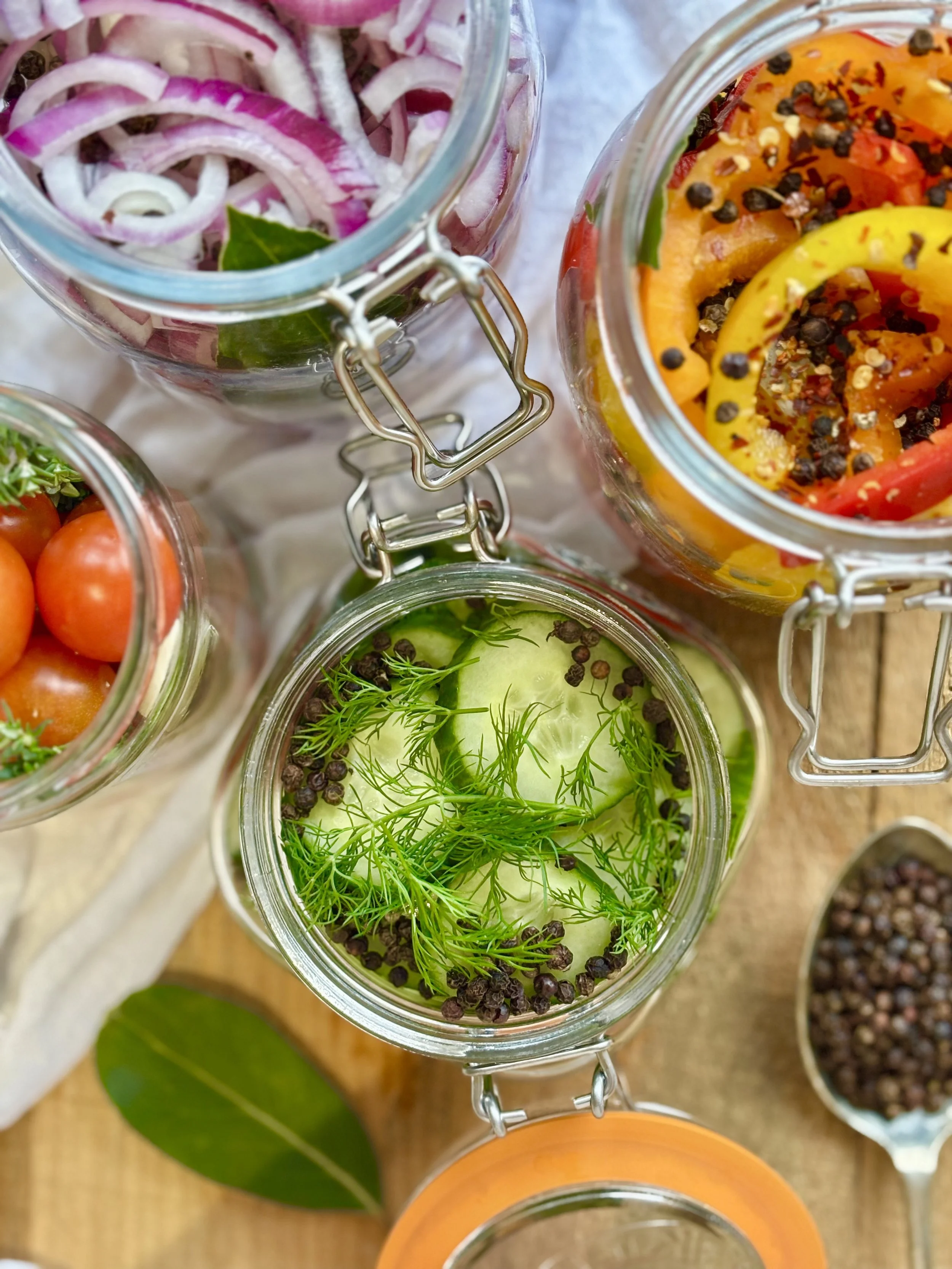 When I’m having a pickling day (actually you can make several jars in an hour or so – they’re quick to make), I like to prepare a few different types to get a range of nutritional benefits. In my latest batch, I pickled red onions, mixed peppers, cherry tomatoes, and cucumber, flavouring them all slightly differently to bring out their unique flavours. It’s one of the fun things about pickling – you can experiment with different combinations of veggies, herbs, and spices to see which ones you like best.