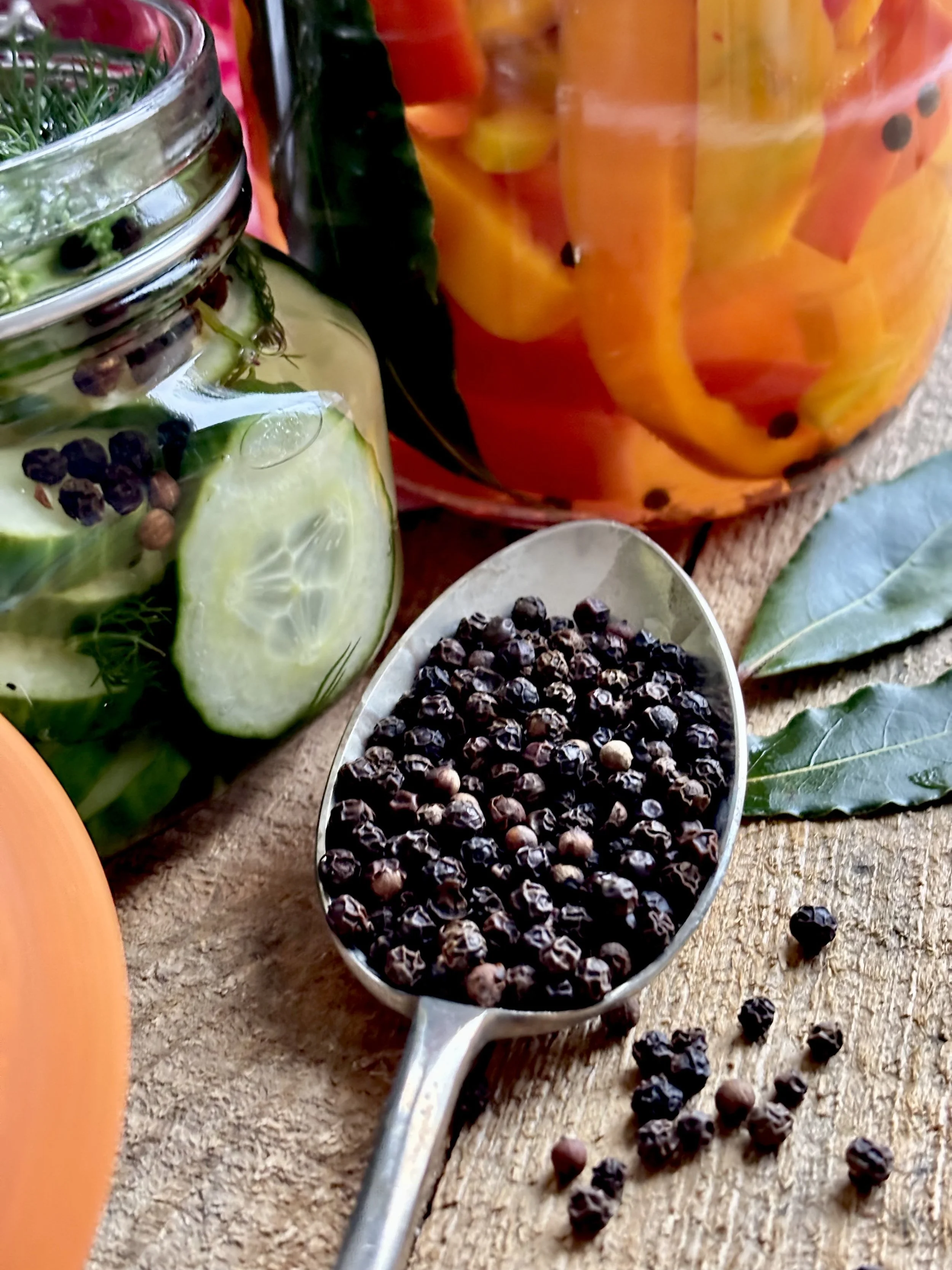 Every jar, when filled with veggies, gets 1 tsp of black peppercorns and one or two bay leaves (fresh or dried) added as base seasonings, but you can then add more as outlined above.